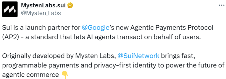 - Sui 成为 Google 新支付协议 AP2 首批合作伙伴
