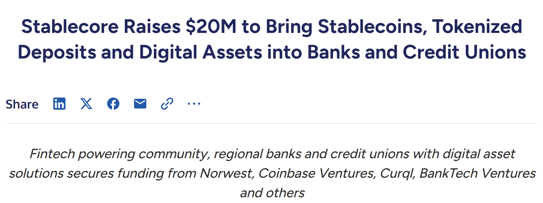 - 美国社区银行 Stablecore 完成 2000 万美元融资,Coinbase Ventures 等参投