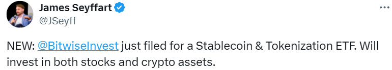 - Bitwise 提交稳定币与代币化 ETF 申请