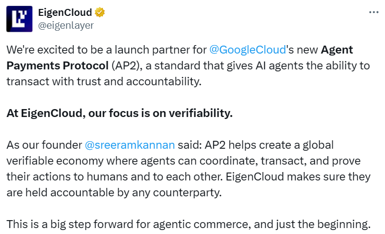 - EigenCloud 将为谷歌云新代理支付协议 AP2 提供可验证性基础设施