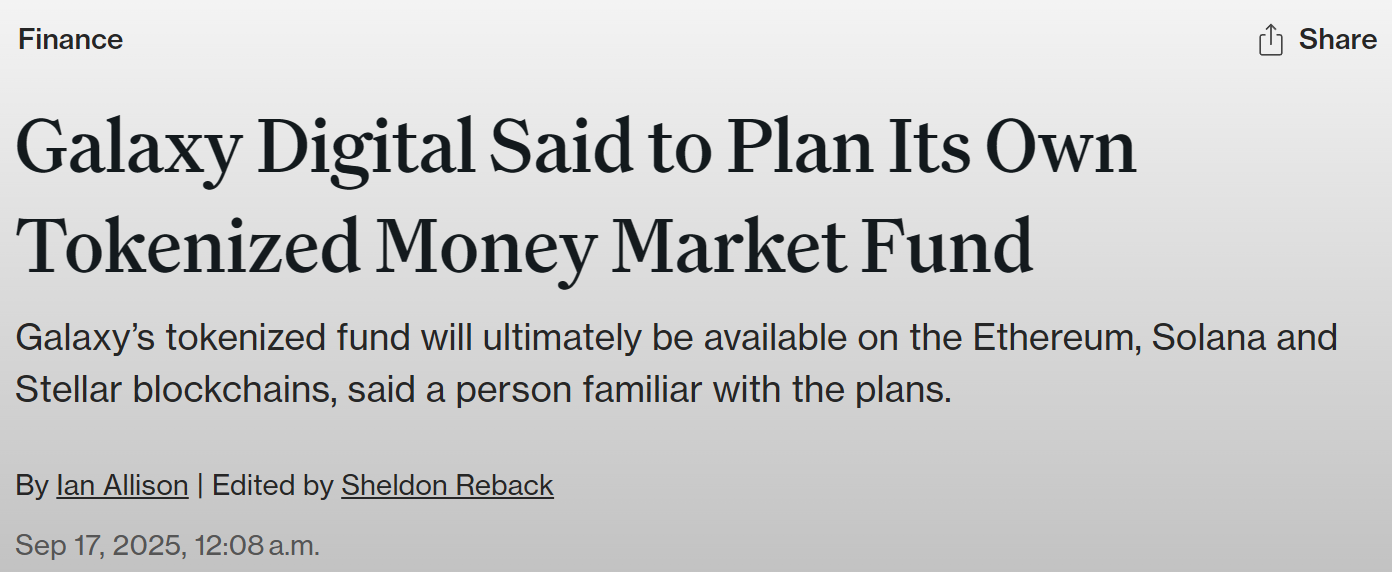 - Galaxy Digital 计划推出自有加密代币化货币市场基金