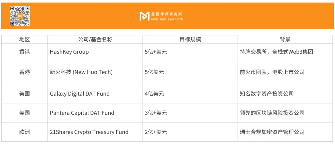 - 基金模式:HashKey 于 2025 年 9 月宣布推出亚洲最大的多币种 DAT 生态基金,首期募资规模超过 5 亿美元,专注于投资全球优秀的 DAT 项目,初期重点是比特币和以太坊生态。