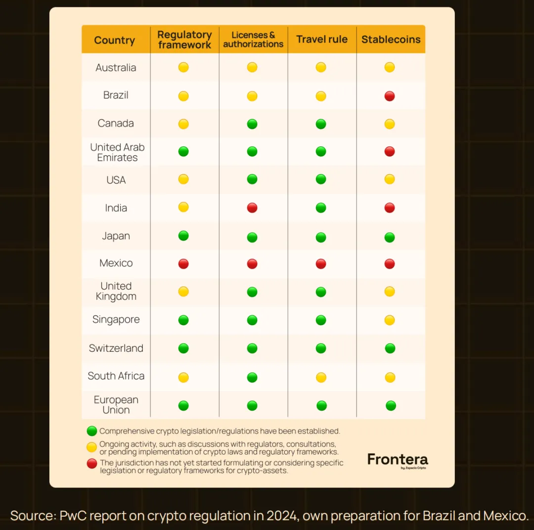 当然,监管灰犀牛仍在路上。法规一日不定,合规成本就一日悬在头顶。但多数团队已学会 “边航行边修船”:在条文更新前留好接口,在政策落地时迅速切换。最终谁能跑出,取决于各国监管框架的清晰度。巴西就是 “清晰” 带来的红利样本。明确的上位法、可预期的合规清单,让全国集聚了区域近半数项目,资本与人才持续南下。相反,在法规多变或缺位的墨西哥,团队把大量精力花在 “猜政策” 上,创新节奏被迫放缓,生态天花板提前被焊死。