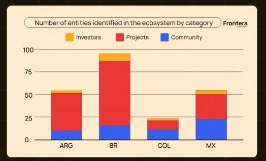 - 阿根廷(42 个项目)借助经济困境反而成为创新温床,尤其在资产代币化与 DeFi 领域;规模虽小,却凭借韧性与创造力产出高度贴合本土需求的解决方案。