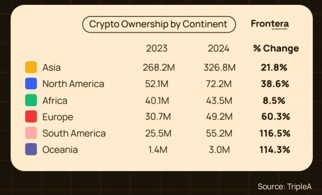 过去 15 年,加密货币从自由主义极客的小众玩具,演变为全球金融版图的关键组成,彻底改变了我们对货币与价值的认知与使用方式。TripleA 数据显示,全球持有虚拟资产的人口已增至 5.62 亿(2023 年为 4.2 亿),占世界总人口的 6.8% 。