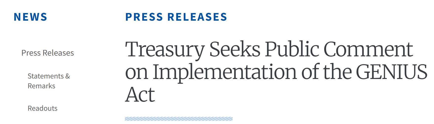 - 美国财政部就《GENIUS 法案》的实施征求公众意见