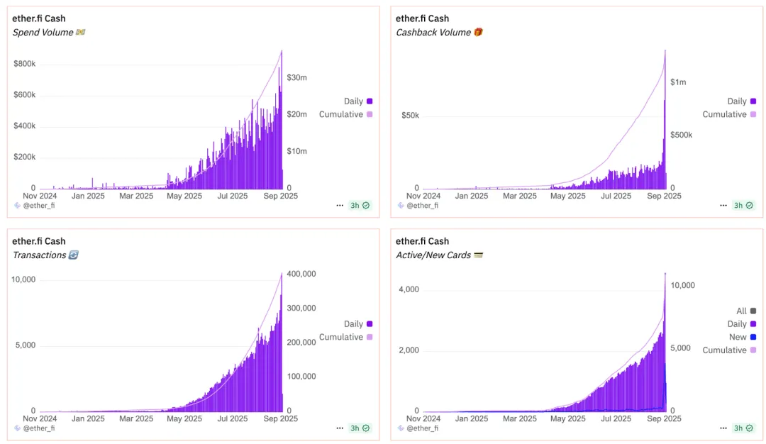 IOSG 其实早就在 To C 应用端有所布局,并且投资了 Ether.fi。一个能生息的支付超级应用,其卡交易量,cash back 体量,交易笔数和发卡量,均在 9 月达到其历史最高值。