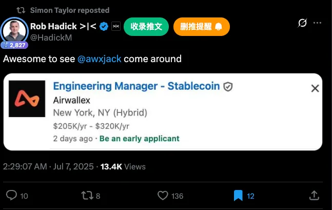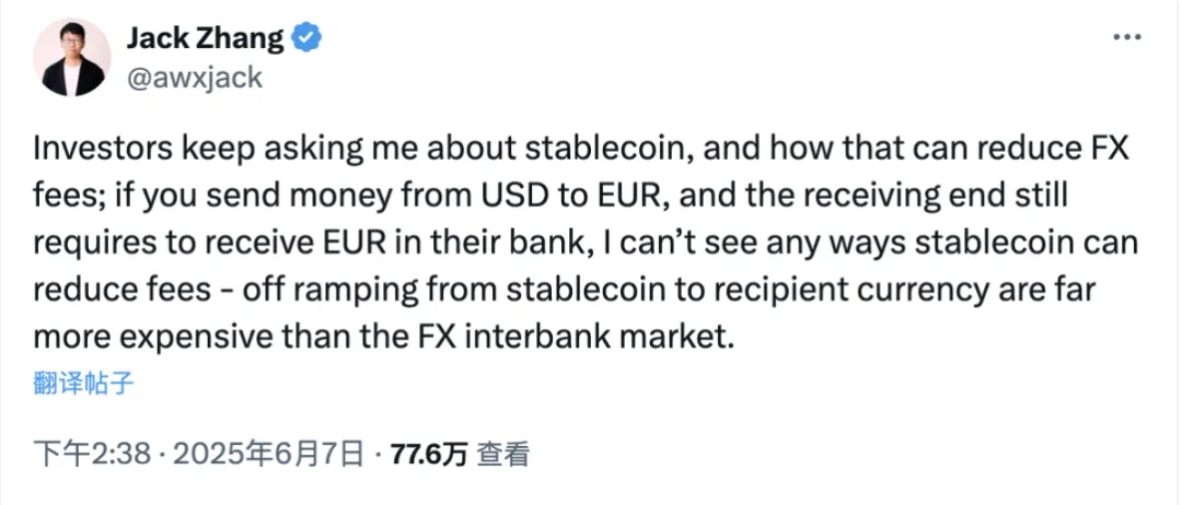 这也是为什么我们在早些时间看到,Airwallex,这一 Web2 企业跨境转账巨头,实实在在的感受到了,稳定币跨境支付企业的威胁,在推特上发表了防御性的言论,但是确在其招聘网站上公开招募稳定币的开发者。