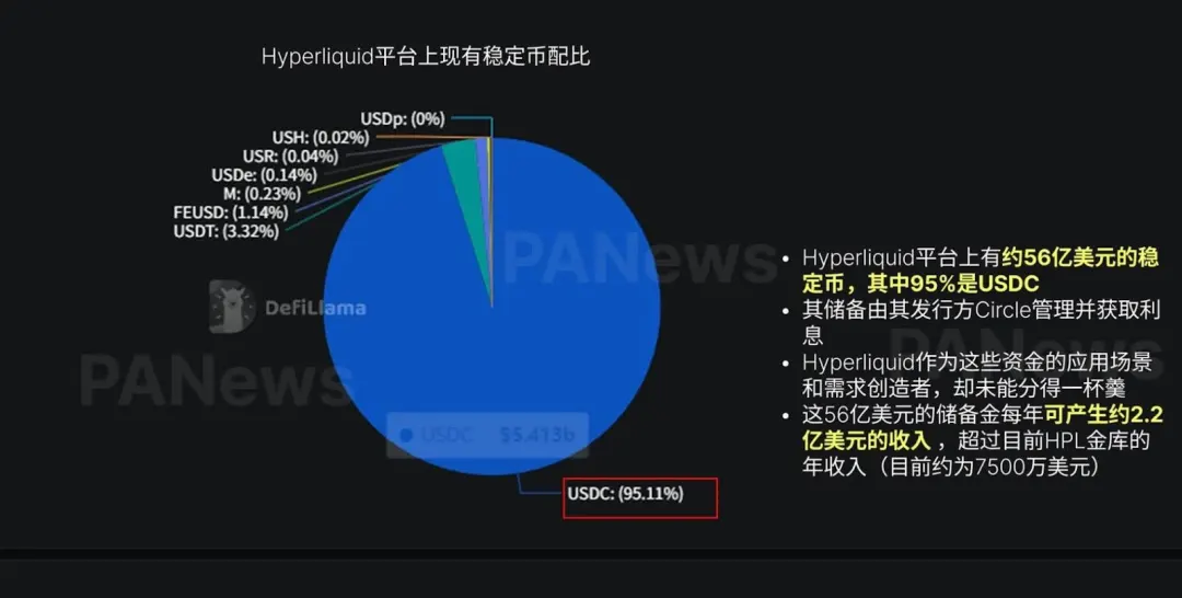 Hyperliquid 推出 USDH 的动机十分直接:目前平台沉淀了约 56 亿美元稳定币资产,其中 95% 为 USDC。这部分资金的储备由发行方 Circle 托管并赚取利息,而作为应用场景与需求创造者的 Hyperliquid 却无法分享到收益。如果这 56 亿美元的存量资金能够被替换为 USDH,按照国债利率计算,预计每年可产生 超 2.2 亿美元的利息收入,远超平台现有 HLP 年收入(约 7500 万美元)。这笔新增收益将用于回购和分配 HYPE,从而反哺生态。