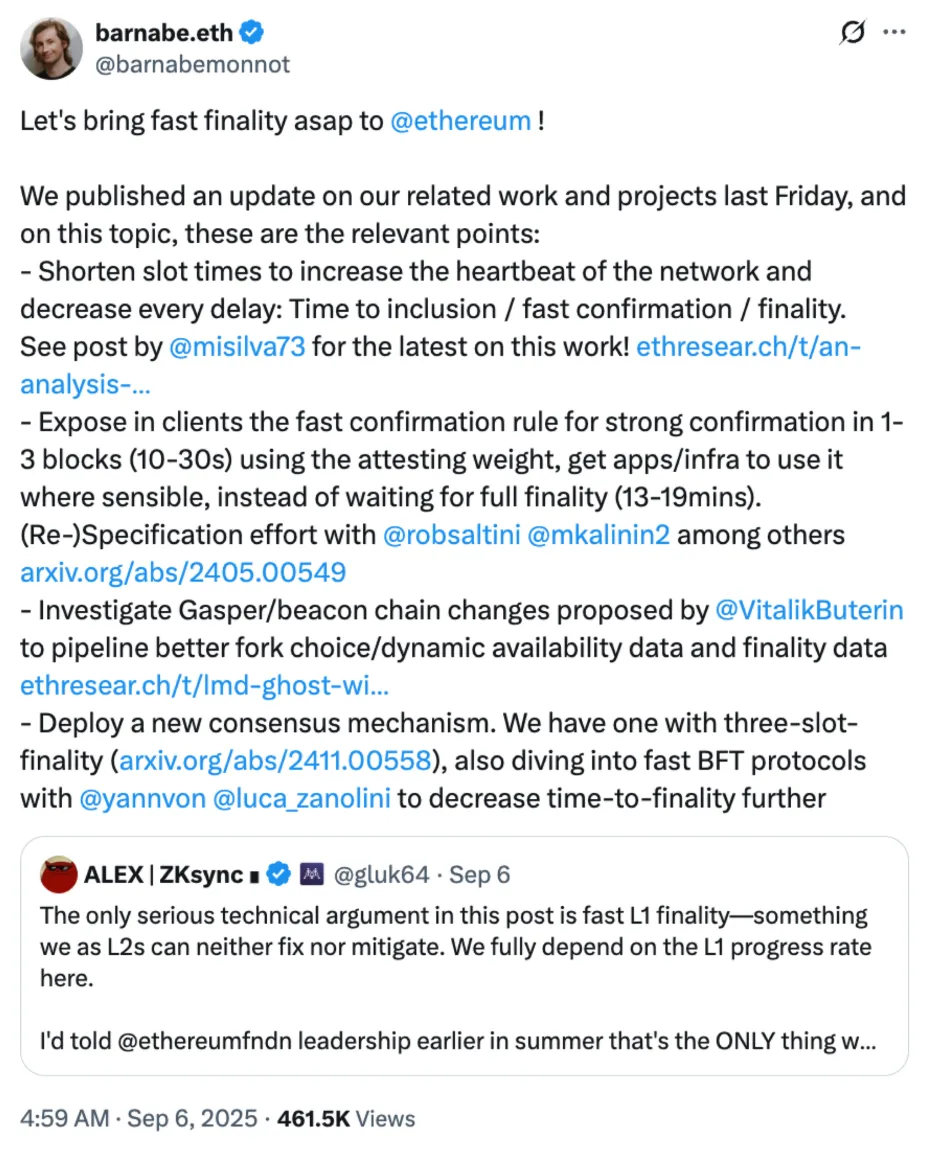 关于不同区块链之间的具体对比,我们会在后续的另一篇文章中进行更为详细的阐述,因此本文暂不展开赘述。当然,以太坊也早就意识到了在不影响去中心化为前提下,Fast Finality 的重要性。社区成员正推动以太坊基金会(EF)加快这一进程,EF 的 Barnabé Monnot 分享了正在进行中的计划: