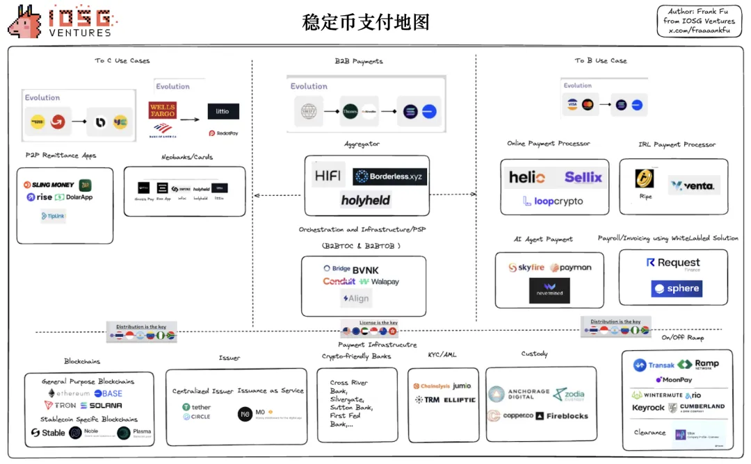 - 消费者价值由 B2B 驱动:个人之间 P2P 汇款与加密卡固然重要,但笔者认为最大规模的 TAM 将发生在企业之间的跨境支付领域。那些将稳定币抽象化、直接嵌入大型公司转账体系的加密编排层和 PSP,可以捕捉到巨大的资金流与资金沉淀所带来的额外收益。