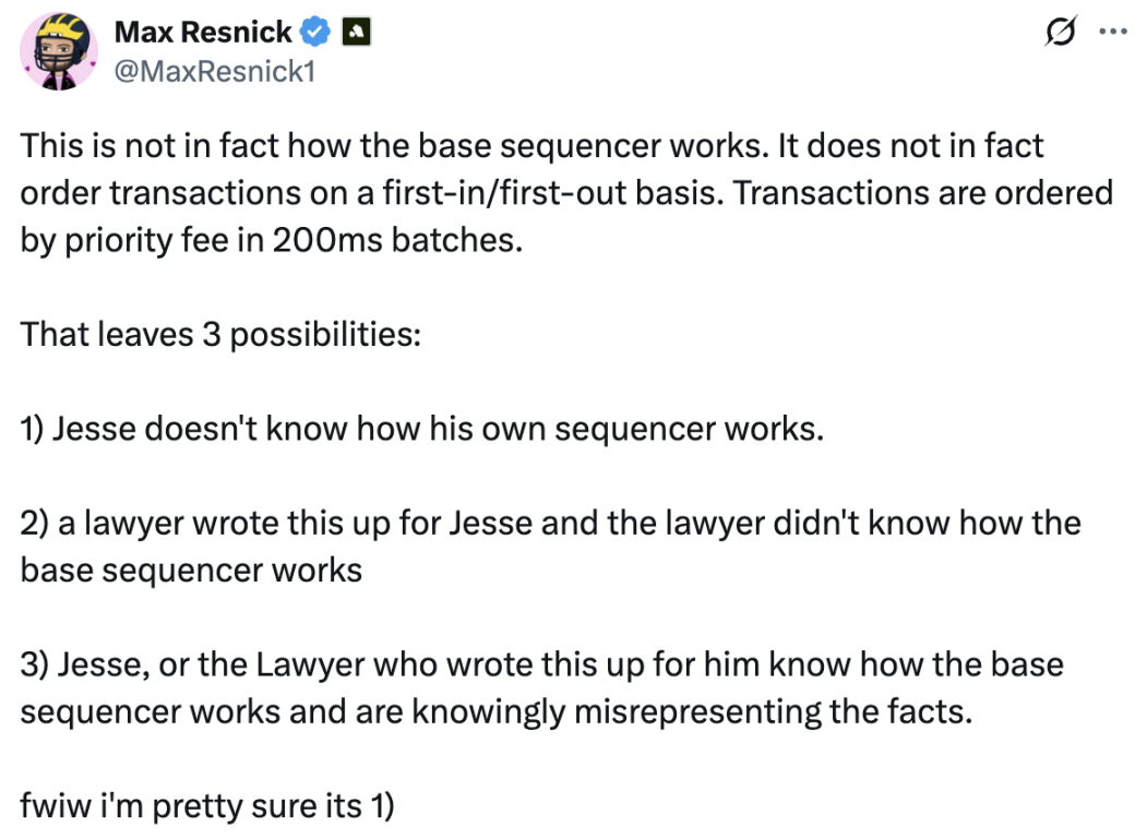 专注于 Solana 的研发公司 Anza 的首席经济学家 Max Resnick 就针对 Jesse Pollak 的说法提出了质疑,Max Resnick 表示 Base 的排序器是以 200 毫秒为单位以优先级费用对交易进行排序,并非是遵循先进先出原则。虽然之后 Jesse Pollak 对此进行了解释,但很明显 Max Resnick 想要表达的关键点就是排序器是可以按照某些规则对交易重新排序的,直指排序器中心化的问题。