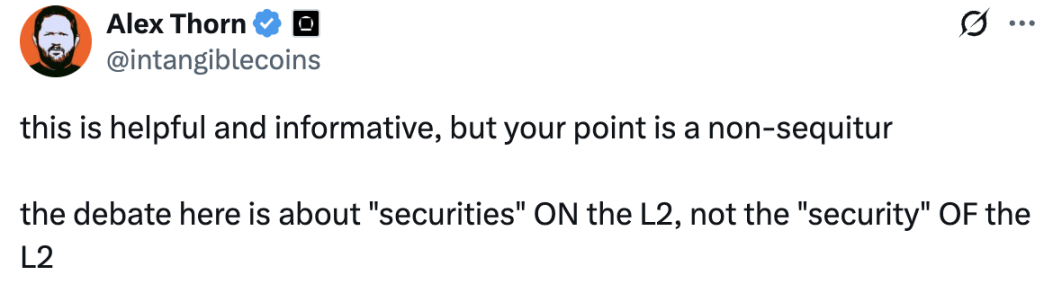 Galaxy 研究主管 Alex Thorn 认为 Vitalik 的观点并没有切中要点,其表示,讨论的重点应是 L2 上的证券(securities),而不是 L2 的安全性(security)。虽然 Alex Thorn 没有明示,但其观点却指向了一个非常致命的问题:L2 本身并非交易所,但如果 L2 上的交易平台是建立在一个非常中心化的链上,那么这些交易平台是否还能被称为 DEX 以及是否应该受到监管?