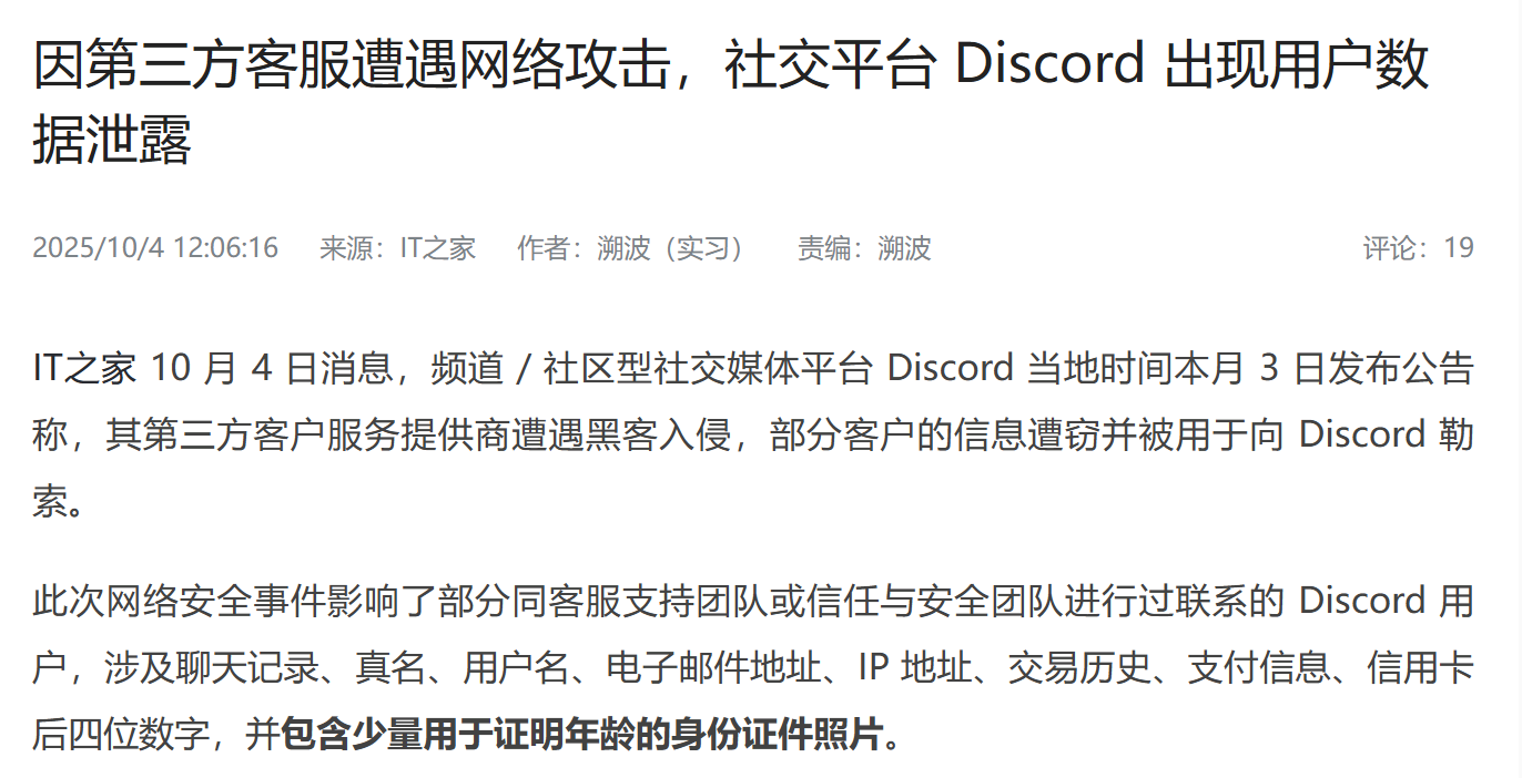 - Discord 因第三方客服提供商遭遇网络攻击,导致部分用户数据泄露