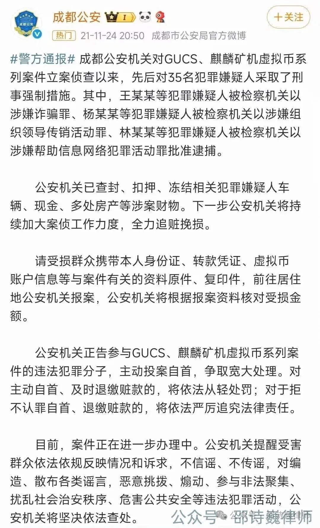 成都 “GUCS 麒麟矿机” 案是近年规模较大的案件之一。2023 年,法院对该案作出判决:主犯因集资诈骗罪被判处无期徒刑,核心成员因组织、领导传销活动罪获刑 15 年,部分人员还因掩饰、隐瞒犯罪所得罪、帮助信息网络犯罪活动罪承担刑责。涉案金额高达十余亿元,参与人数遍及全国。