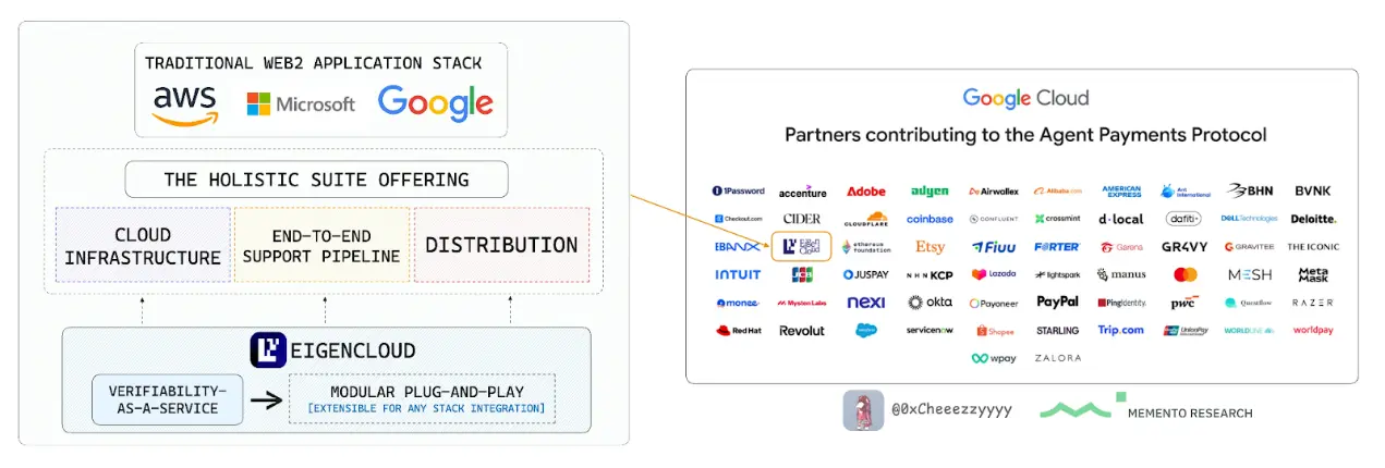 这种包容性因战略伙伴关系而得到加强。谷歌的新代理支付协议(AP2)标志着人工智能代理作为有意义的经济参与者迈出了一大步。EigenCloud 提供了可验证性的基础架构,通过将 VaaS 嵌入更广泛的分发渠道和工作流程,确保这些代理对任何交易对手负责。