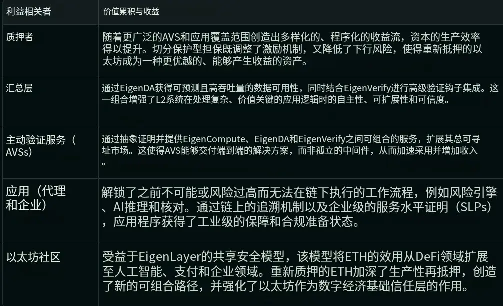 这些利益相关者的利益共同体现了 EigenCloud 如何将可验证性转化为共享经济产品,而非孤立的功能。通过包容性的激励机制,该网络确保价值向多个方向流动,同时巩固了加密经济安全性的同一基础。这种增长不仅扩大了 EigenCloud 的采用范围,也增强了其防御性。