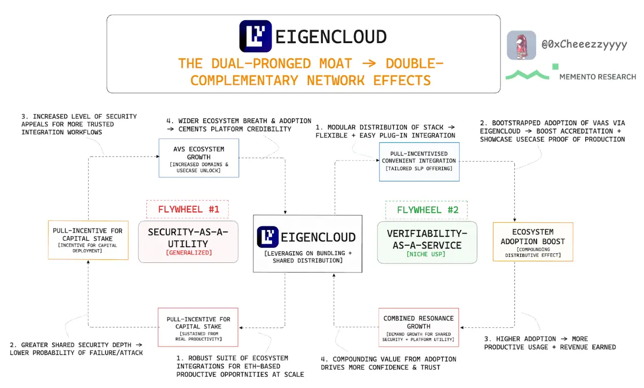 这一双重基础启动了两个相辅相成的飞轮:(1)安全驱动的采用和(2)可验证性驱动的分发,二者共同巩固了 EigenLayer 的主导地位。