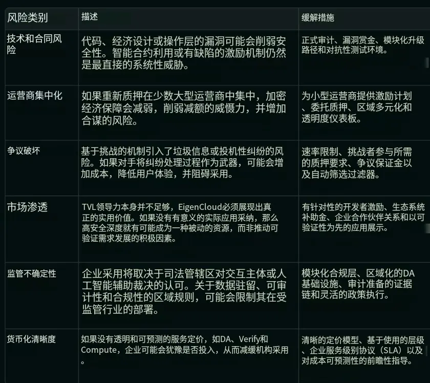尽管结构性优势显而易见,但 EigenCloud 还需应对一系列可能影响长期采用和防御能力的风险。