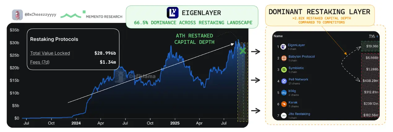 EigenLayer 是首个开创共享安全的平台,正式确立了全新的 “信任即服务” 类别,并催生了如今价值 289 亿美元的再质押市场。