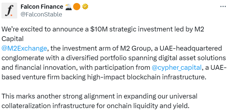 - Falcon Finance 完成 1000 万美元战略轮融资,M2 Capital 领投