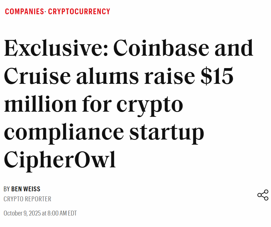 - 加密合规公司 CipherOwl 完成 1500 万美元融资,General Catalyst 和 Flourish Ventures 领投