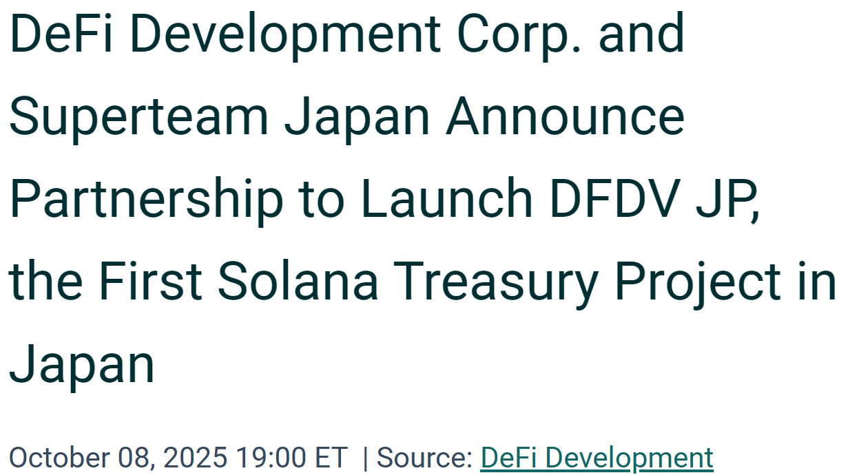 - DeFi Development 在日本推出以 Solana 为重点的数字财库项目 DFDV JP