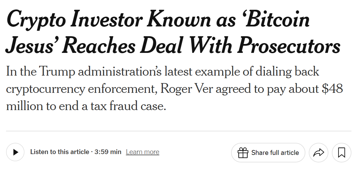 - 比特币早期投资者 Roger Ver 拟支付 4800 万美元与美国司法部达成暂缓起诉协议
