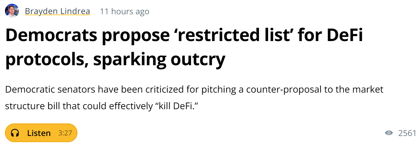 - 美国民主党提议将高风险 DeFi 协议列入限制名单