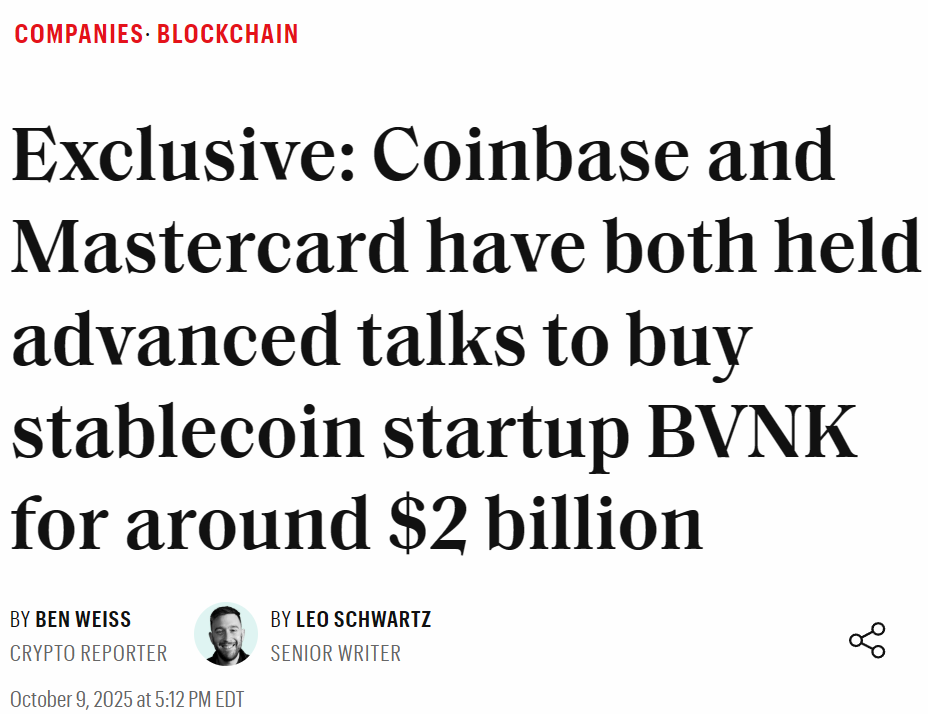 - Coinbase 与万事达卡均已就收购稳定币初创公司 BVNK 展开谈判