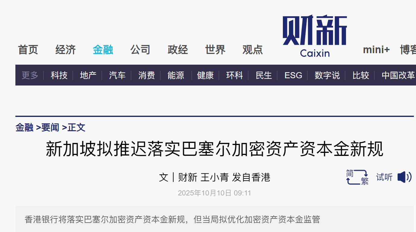- 新加坡拟推迟落实巴塞尔加密资产资本金新规