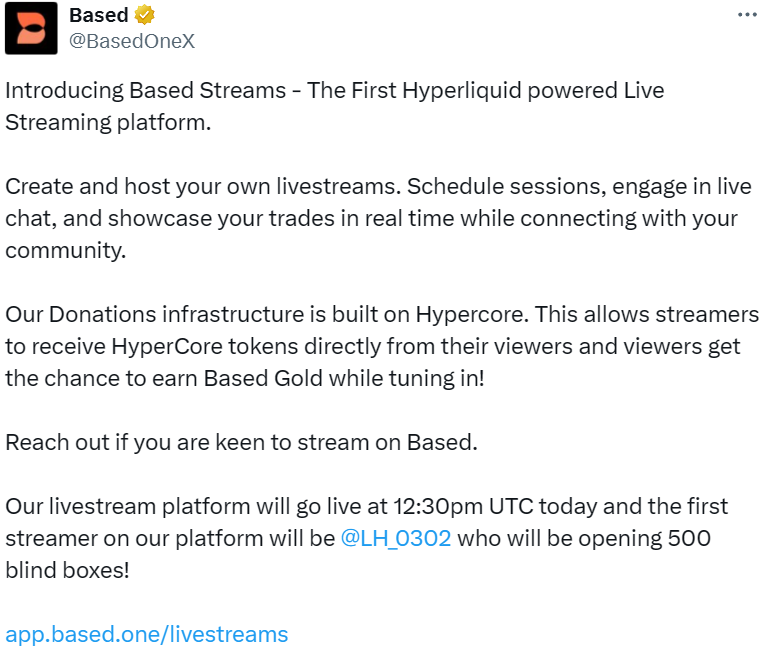 - Based 推出由 Hyperliquid 提供支持的直播平台「Based Streams」