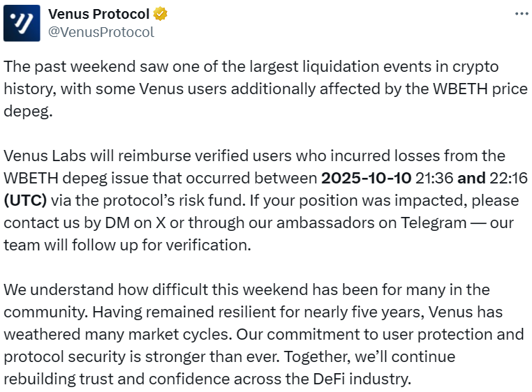 - Venus:将通过协议风险基金补偿清算期间受 WBETH 脱钩影响受损的用户