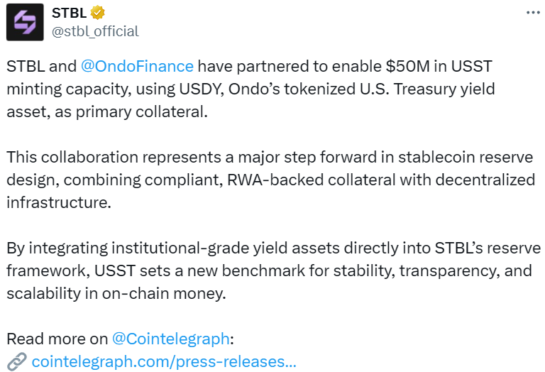 - STBL 与 Ondo 合作,将以 USDY 为主要抵押资产发行 USST 稳定币