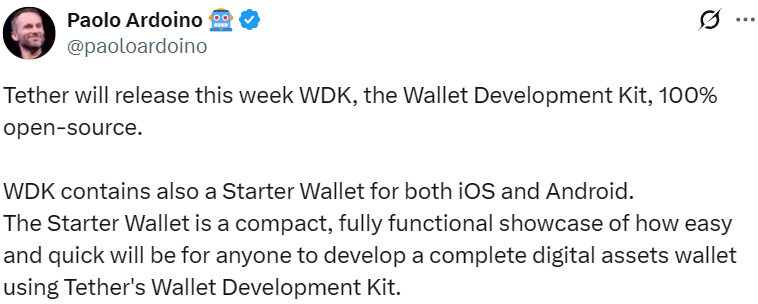 - Tether 将于本周发布完全开源的钱包开发工具包 WDK