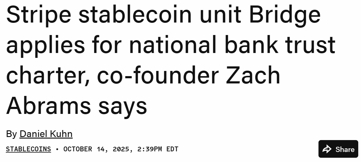 - Stripe 旗下稳定币公司 Bridge 申请美国国家银行信托牌照