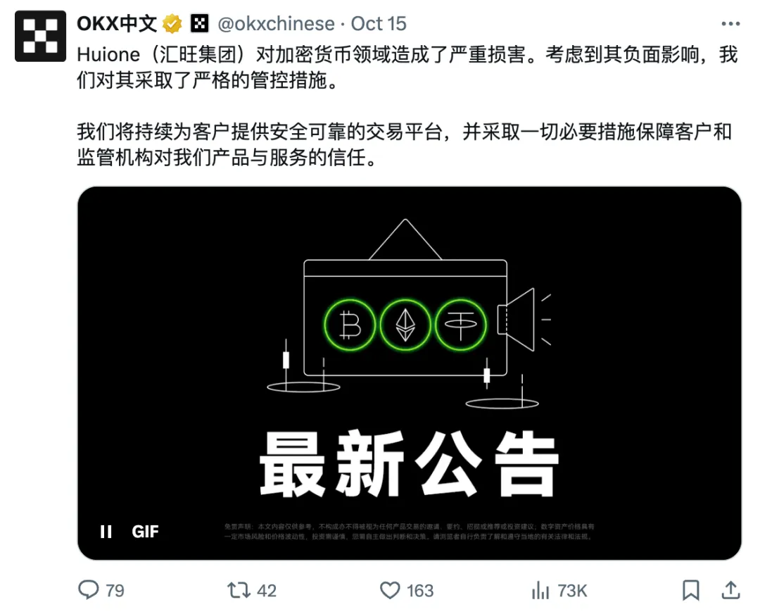 制裁行动公布后,部分交易所如 OKX 公开表示,将对 Huione 采取严格的管控措施。