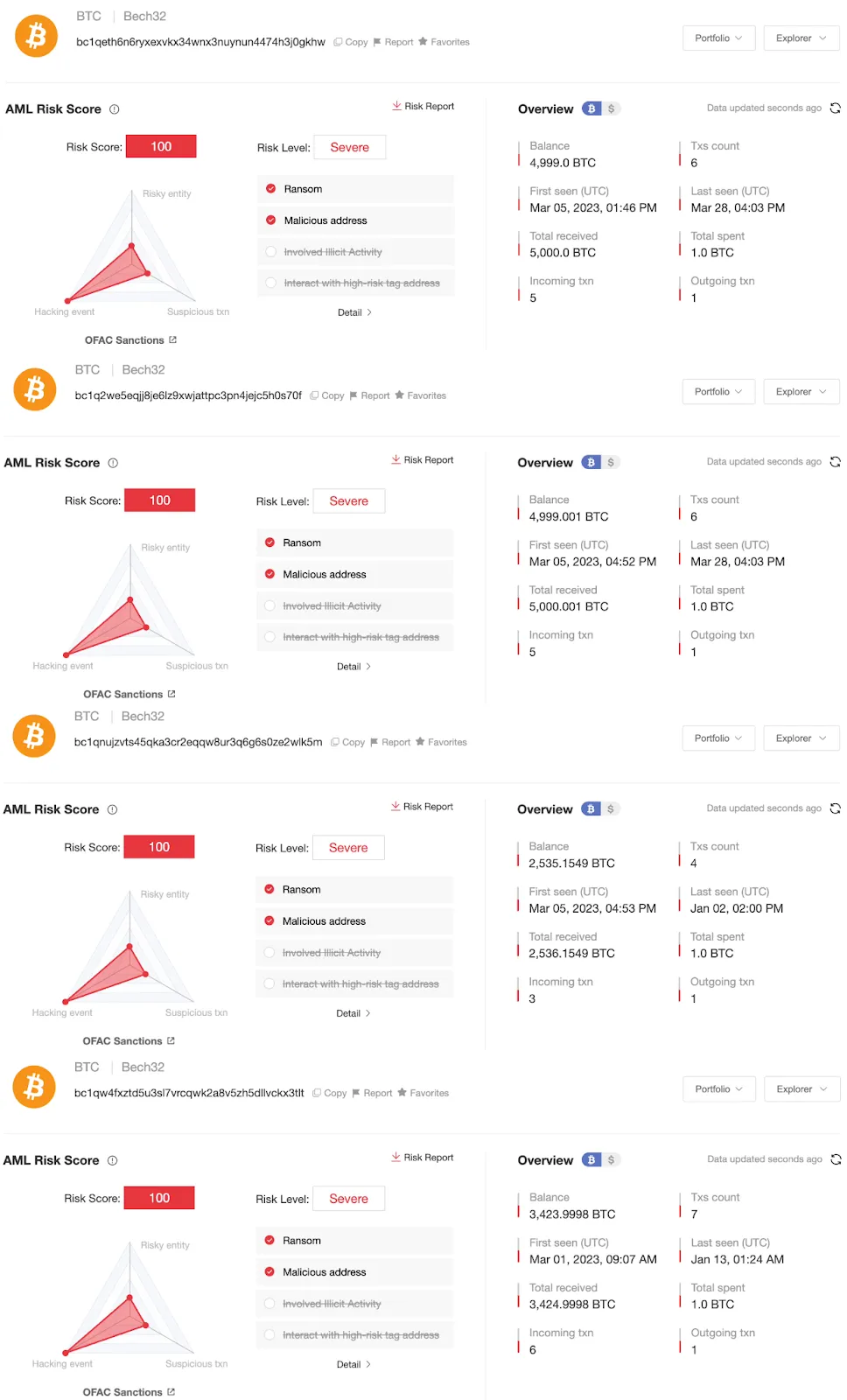 据链上反洗钱与追踪工具 MistTrack 分析,这四个地址均从 2023 年 3 月开始活跃,到目前共接收了 15,961.15 BTC,且每个地址均只转出了 1 BTC 到下一层地址。