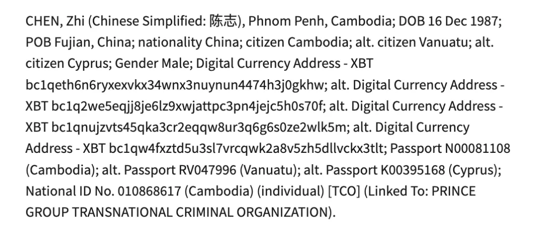 在本次制裁行动中,四个由陈志直接控制的比特币地址被 OFAC 列入制裁名单: