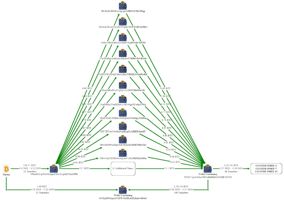 FBI 在起诉书中将这些地址分为多个集群 (Cluster Index 1–13),这些集群内的地址表现出高度一致的资金流动模式,显示出明显的洗钱行为特征。