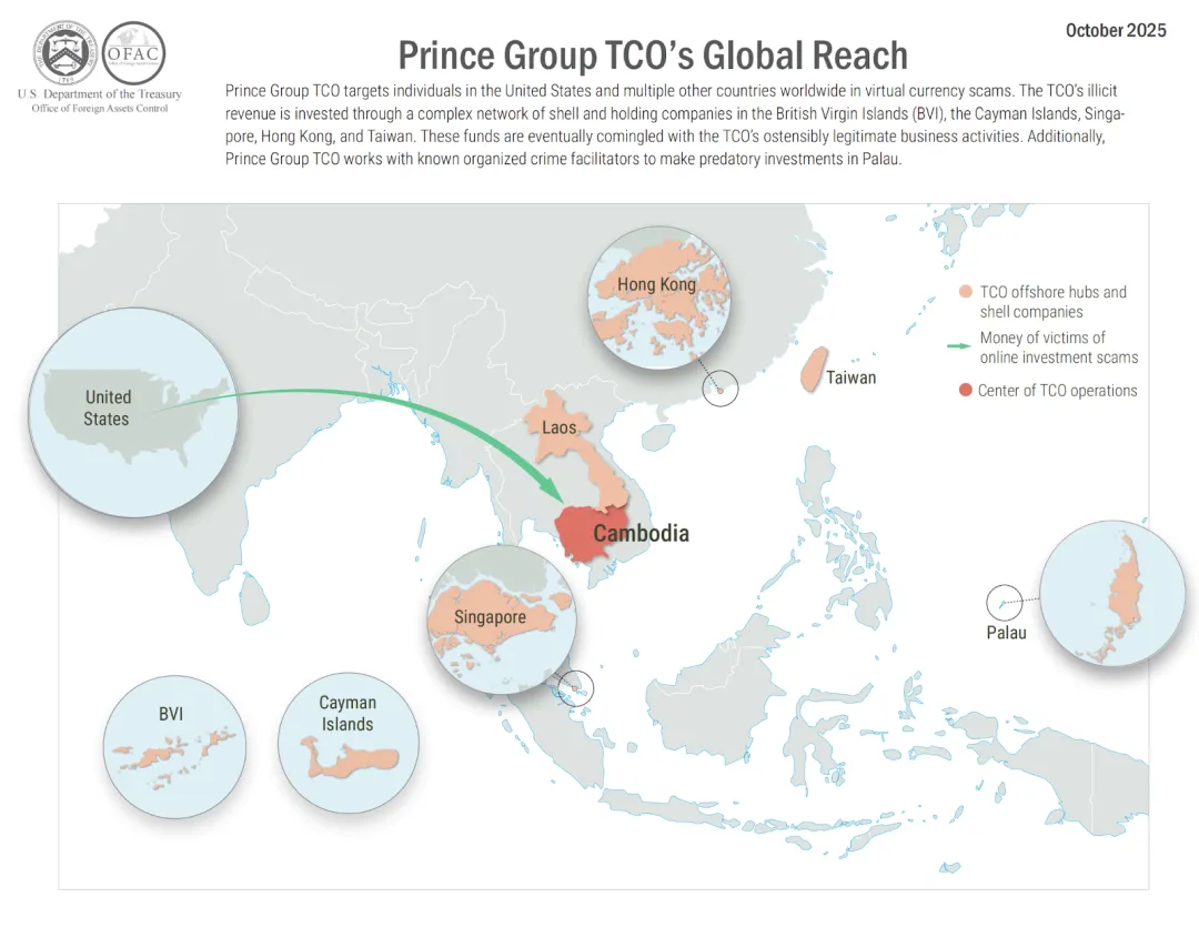 2025 年 10 月 14 日,美国财政部外国资产控制办公室 (OFAC)、金融犯罪执法网络 (FinCEN) 与英国外交&联邦及发展事务部 (FCDO) 对活跃于东南亚的网络犯罪集团采取史上最大规模的联合制裁行动。此次行动不仅制裁了 146 个与 “太子集团跨国犯罪组织 (Prince Group TCO)” 有关的个人和实体,还宣布扣押与太子集团相关联的 127,271 枚比特币(约 150 亿美元)。与此同时,FinCEN 将总部位于柬埔寨的 Huione Group 认定为主要洗钱机构,将其与美国金融体系完全隔离。