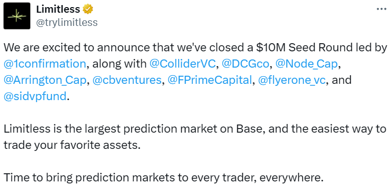 - Limitless 完成 1000 万美元种子轮融资,1confirmation 领投