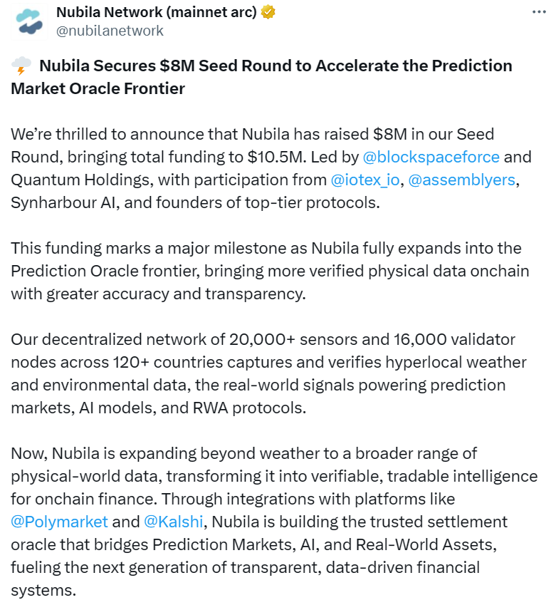 - 去中心化数据基础设施 Nubila 宣布完成 800 万美元种子轮融资