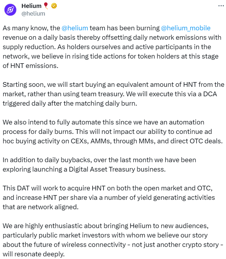 - Helium 拟推出 HNT 自动回购机制并探索数字资产财库业务