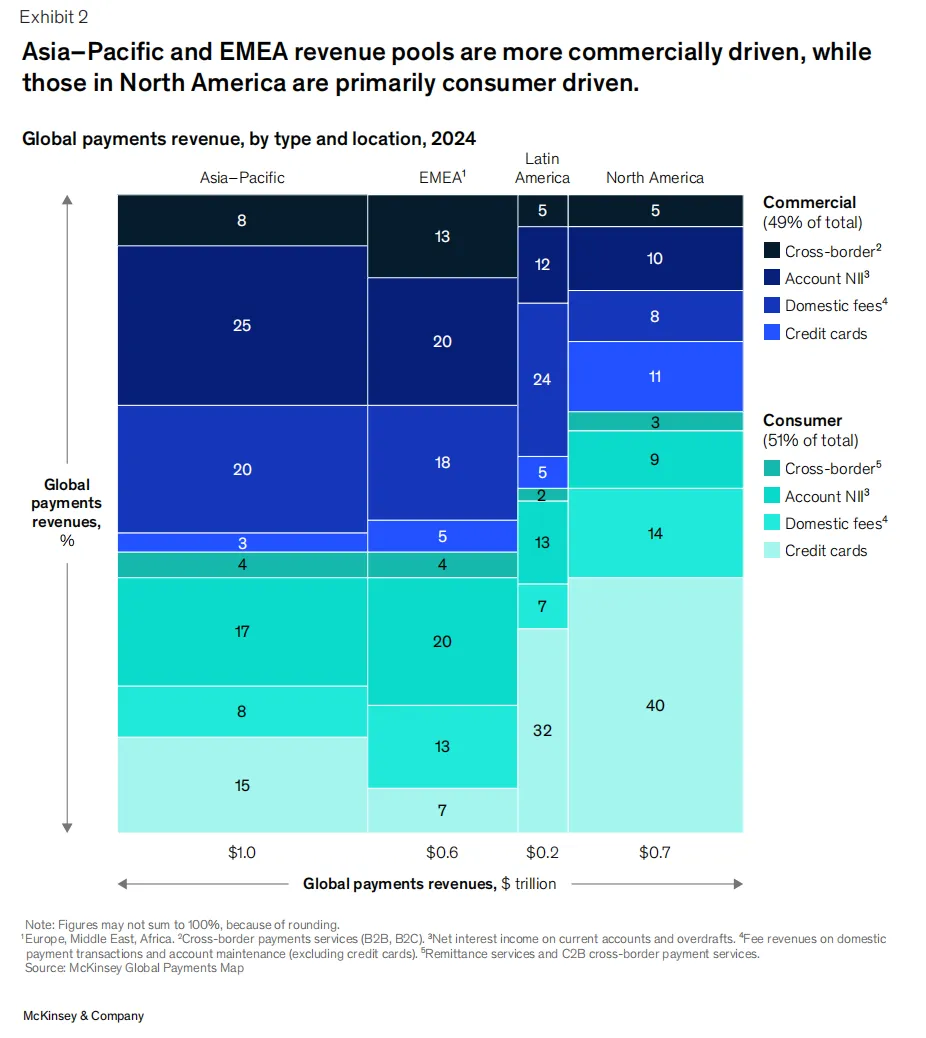 总体来看,全球支付收入在消费者端与商业端几乎平分,但各地区构成差异显著。