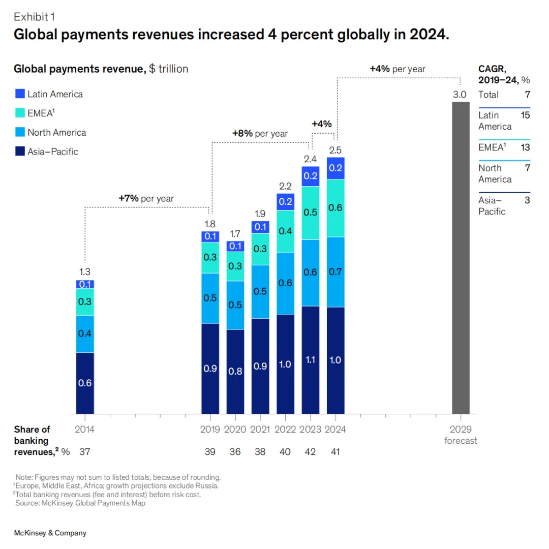 分地区看,拉美增长 11%,欧中非(EMEA)和北美分别增 8% 和 5%,亚太(APAC)则下滑 1%。尽管如此,支付仍是金融领域最具价值子行业,2024 年平均股本回报率 18.9%,部分机构超过 100%。