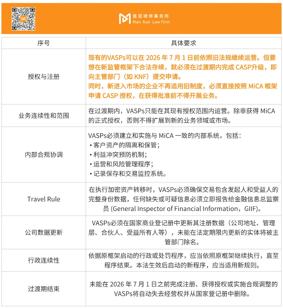 为帮助市场平稳过渡避免运营中断,法案为现有加密资产服务提供商(VASPs)注册实体建立了过渡期:目前按照反洗钱法规注册的 VASPs,可在 2026 年 7 月 1 日前按照现行规则继续合规经营,但必须逐步升级至新标准,直到获得 CASP 授权或截止日期。以下是法案对过渡期的具体要求,另外市场主体也需要注意配套法案落地的次级规则出台的生效情况。