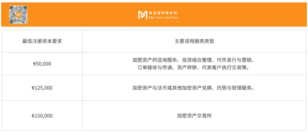 - CASPs 的年度牌照维护费与监管费:以过去 3 年的平均总收入为基础,收取区间为€500- 平均年收入 0.4% 的年费