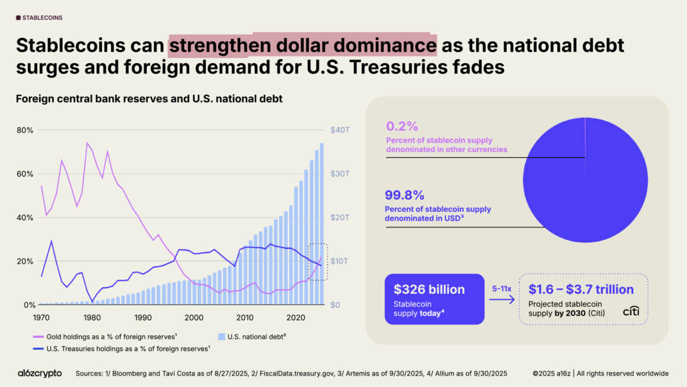 但稳定币却逆势而上:99% 的稳定币以美元计价,且预计到 2030 年规模将增长 10 倍,突破 3 万亿美元。这意味着未来几年,稳定币可能成为美国国债需求的强劲且可持续来源,在外国央行减持之际,进一步巩固美元的全球主导地位。