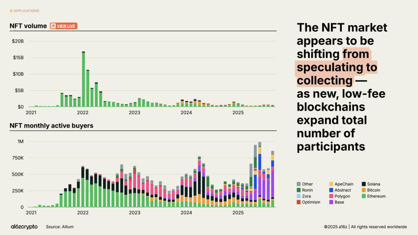 NFT(非同质化代币)市场交易量虽远未达到 2022 年的峰值,但月活跃买家数量持续增长。这一趋势表明,消费者行为正从投机转向收藏。 这一转变的背后,是 Solana、Base 等公链低成本区块空间的普及。